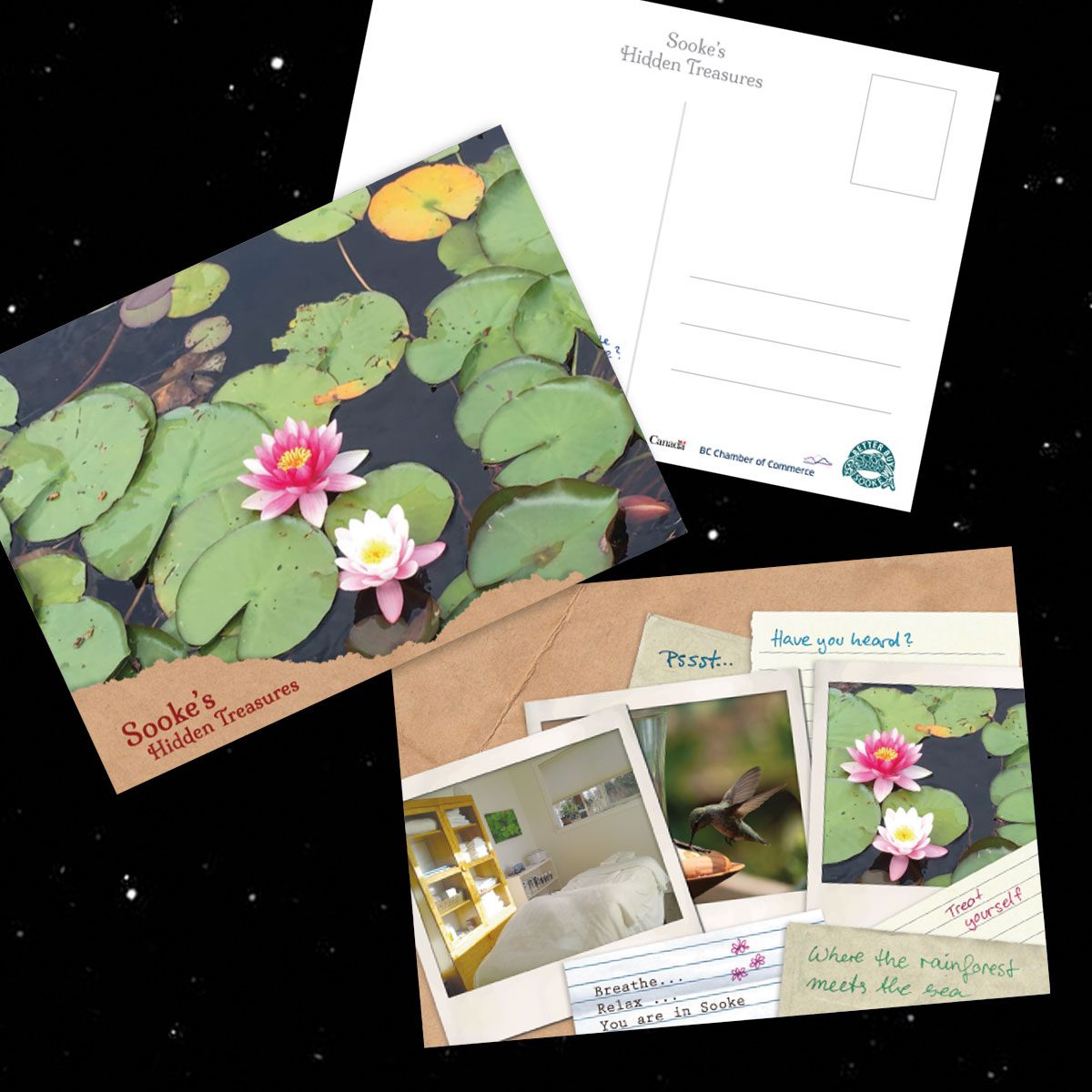 The rack card followed a more traditional tourism format, but with the same emphasis on warmth, whimsy, and community spirit. It was distributed far and wide across Vancouver Island, from ferry terminals to airport info stands.